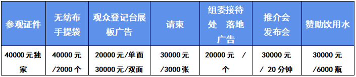 品牌展位:國內企業:(長×寬×高:6m×3m×4.5m)¥30,000 / 18㎡;國際企業:¥,40,000/18㎡(含鋼制桁架搭建、噴繪制作、地毯、洽談桌椅及照明等)