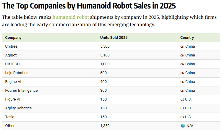 2025年,特斯拉交付了150輛Optimus,預(yù)計(jì)將于2027年開始公開銷售。同樣,其他美國(guó)領(lǐng)先公司 Figure AI 和 Agility Robotics 的出貨量也大致相同。盡管迄今為止交付量有限,F(xiàn)igure AI 的估值仍飆升至 390 億美元,遠(yuǎn)高于 2024 年的 26 億美元。中國(guó)憑借完善的供應(yīng)鏈體系、核心技術(shù)自主化突破及多場(chǎng)景落地優(yōu)勢(shì),穩(wěn)居全球人形機(jī)器人產(chǎn)業(yè)第一大國(guó)。