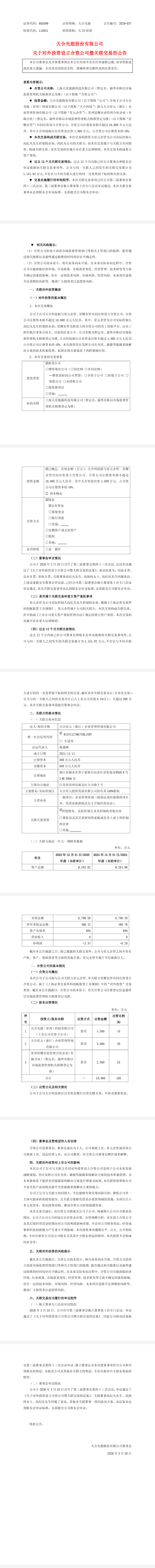 天合光能3月25日發布公告,公司全資子公司天合光能(常州)科技有限公司(簡稱“天合科技”)擬與天合星元(浙江)企業管理咨詢有限公司、常州星曜企業管理合伙企業(有限合伙)共同出資設立合資公司,合資公司注冊資本擬不超1億元。天合科技擬出資不超4500萬元,占比45%。此次投資旨在發揮公司在光伏、儲能等能源系統解決方案的技術積累優勢,拓展在相關新場景下的跨領域應用。